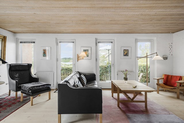 Bemærk den flotte udsigt fra såvel terrasserne som fra stuen. Fra stuen er der adgang til pejsestuen med en flot muret pejsevæg med bænk. Herfra er der udgang til haven mod øst.