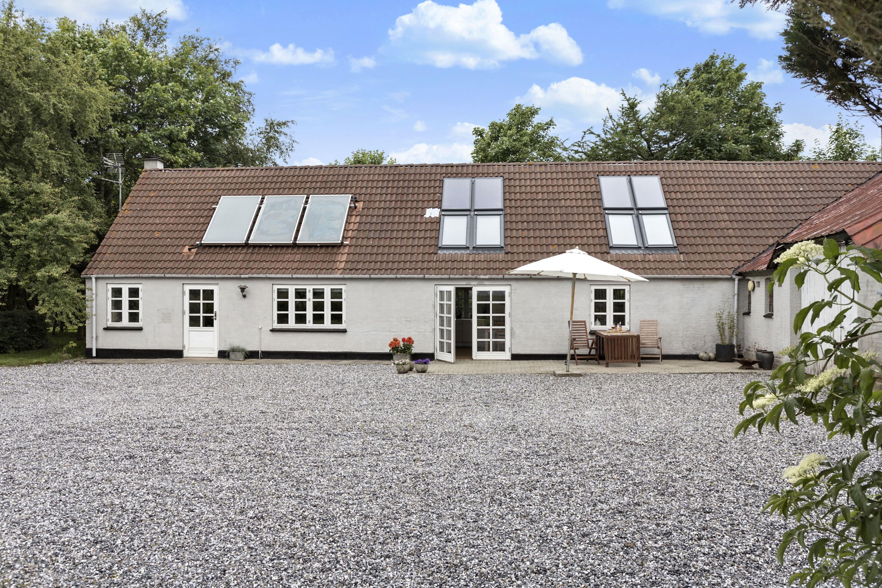 Ejendommen har en klassisk facade med en moderne twist, hvor solceller på marken genererer op til 2,2 kWh, og en solfanger bidrager til varmt vand. Den store have er perfekt til udendørs aktiviteter og afslapning med smuk udsigt over de omkringliggende marker. Det store udhus giver rig mulighed for opbevaring, værksted eller hobbyrum.
