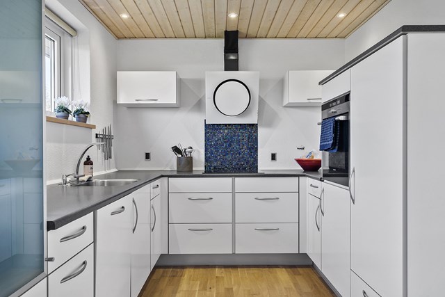 Hjemmet er indrettet med et virkelig skønt opholdsrum, bestående af køkken i åben forbindelse med stuen. Køkkenet fremstår med enkelt og tidløst design fra Vordingborg Køkkenet. Det pæne bryggers ligger i forbindelse med både køkkenet og hjemmets 2 børneværelser, så familiens børn kan nemt komme på deres værelser uden at skulle igennem hele huset. I bryggerset er der plads til vaskefaciliteter samt et skab til opbevaring.